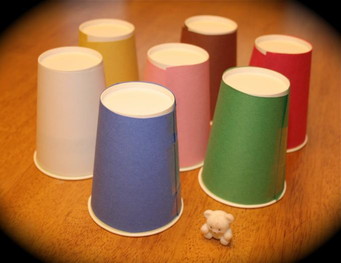 Hide a small object under the paper cup (like a small bear) and have your child guess where it is by asking them…